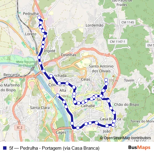 The first stop of the 5f bus route is Portagem (Parque Manuel Braga) and the last stop is Pedrulha (Piscinas Municipais). 5f (Pedrulha - Portagem (via Casa Branca)) is operational during fins de semana.