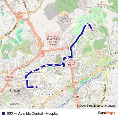 The first stop of the 900 bus route is Central Ii and the last stop is Hospital (Parque). 900 (Avenida Central - Hospital) is operational during todos os dias.