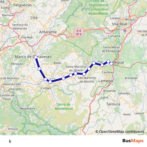 The first stop of the Ir rail route is Regua and the last stop is Marco de Canaveses. Ir is operational during todos os dias.
