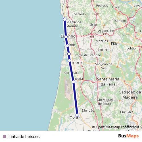 The first stop of the Linha de Leixoes rail route is Ovar and the last stop is Granja. Linha de Leixoes (Linha de Leixoes) is operational during todos os dias.