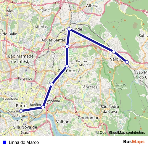 Additional information: Linha do Marco has 8 stops and the total trip duration for this route is approximately 26 minutes.
