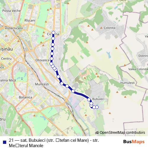 The first stop of the 21 bus route is str-la Școlii and the last stop is bd. Mircea cel Bătrân. 21 (sat. Bubuieci (str. Ștefan cel Mare) - str. Meșterul Manole) is operational during în zilele lucrătoare.