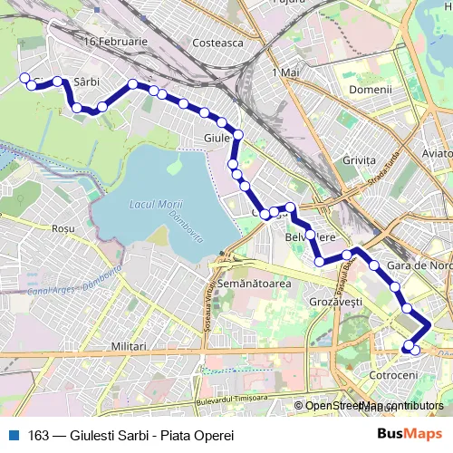 The first stop of the 163 bus route is Piata Operei and the last stop is Giulesti Sarbi. 163 (Giulesti Sarbi - Piata Operei) is operational during zilnic.