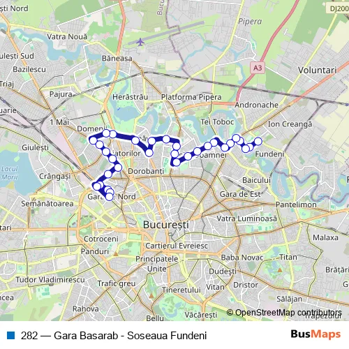 The first stop of the 282 bus route is Soseaua Fundeni and the last stop is Gara Basarab. 282 (Gara Basarab - Soseaua Fundeni) is operational during zilnic.