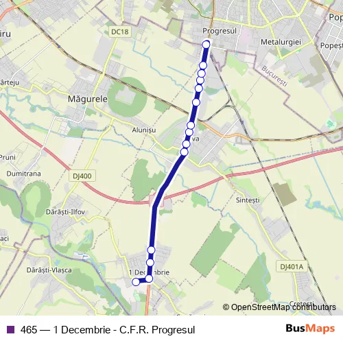 The first stop of the 465 bus route is 1 Decembrie and the last stop is C.F.R. Progresul. 465 (1 Decembrie - C.F.R. Progresul) is operational during zilnic.