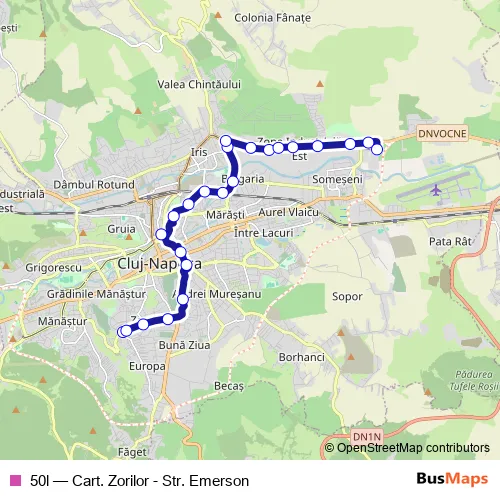 The first stop of the 50l bus route is Disp. Zorilor and the last stop is Emerson Sosire. 50l (Cart. Zorilor - Str. Emerson) is operational during în zilele lucrătoare.