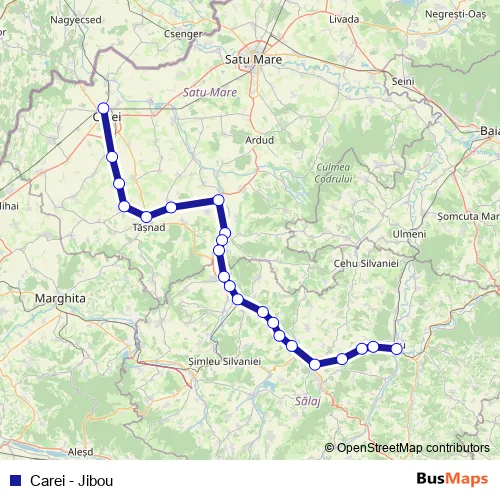 The first stop of the Carei - Jibou rail route is Carei and the last stop is Jibou. Carei - Jibou (Carei - Jibou) is operational during zilnic.