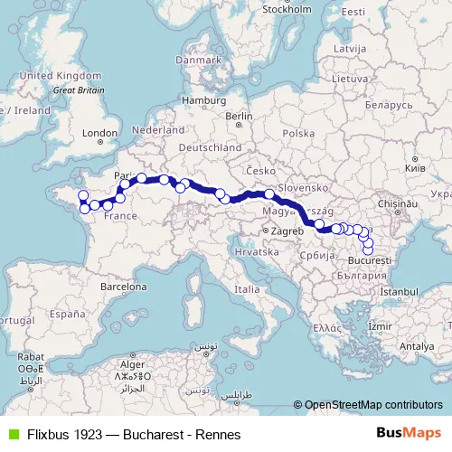 The first stop of the Flixbus 1923 bus route is Bucharest (bus station Militari) and the last stop is Rennes (Central bus station). Flixbus 1923 (Bucharest - Rennes) is operational during zilnic.