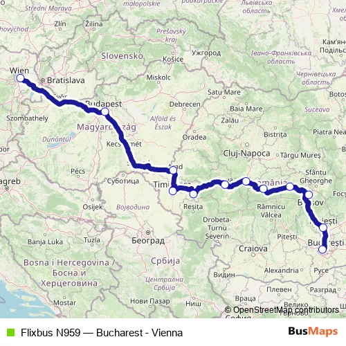 The first stop of the Flixbus N959 bus route is Bucharest (bus station Militari) and the last stop is Vienna Erdberg (Busterminal Vib). Flixbus N959 (Bucharest - Vienna) is operational during în weekend.