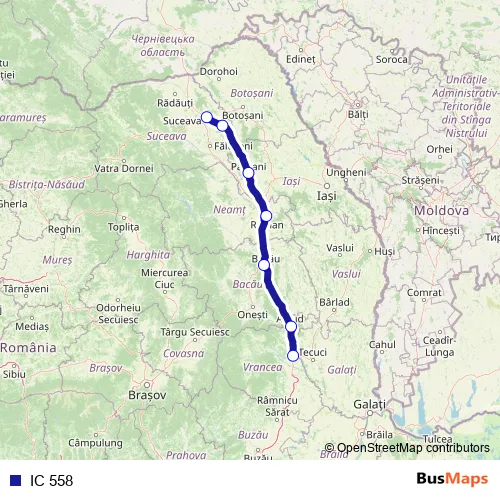 The first stop of the IC 558 rail route is Suceava and the last stop is Mărăşeşti. IC 558 is operational during zilnic.