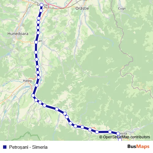The first stop of the Petroşani - Simeria rail route is Petroşani and the last stop is Simeria. Petroşani - Simeria (Petroşani - Simeria) is operational during zilnic.