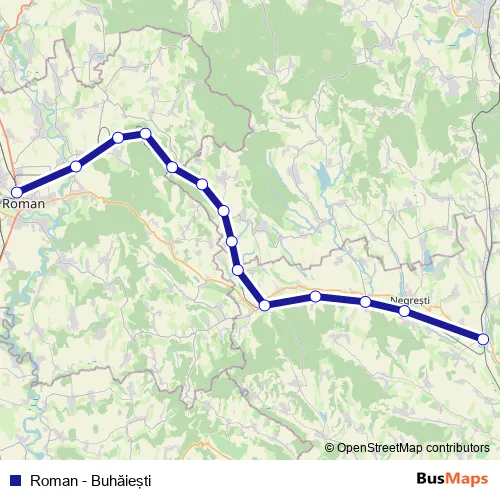 The first stop of the Roman - Buhăieşti rail route is Roman and the last stop is