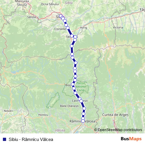 The first stop of the Sibiu - Râmnicu Vâlcea rail route is Sibiu and the last stop is Râmnicu Vâlcea. Sibiu - Râmnicu Vâlcea (Sibiu - Râmnicu Vâlcea) is operational during zilnic.