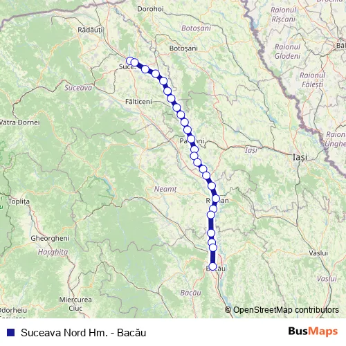 The first stop of the Suceava Nord Hm. - Bacău rail route is Suceava Nord Hm. and the last stop is