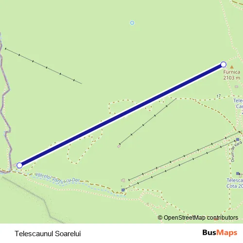 The first stop of the Telescaunul Soarelui cable-car route is Telescaunul Soarelui Debarcare 2100m and the last stop is Telescaunul Soarelui Îmbarcare. Telescaunul Soarelui (Telescaunul Soarelui) is operational during zilnic.