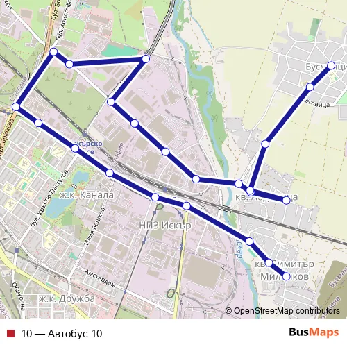 The first stop of the 10 bus route is КВ. Димитър Миленков and the last stop is КВ. Бусманци. 10 (Автобус 10) is operational during ежедневно.