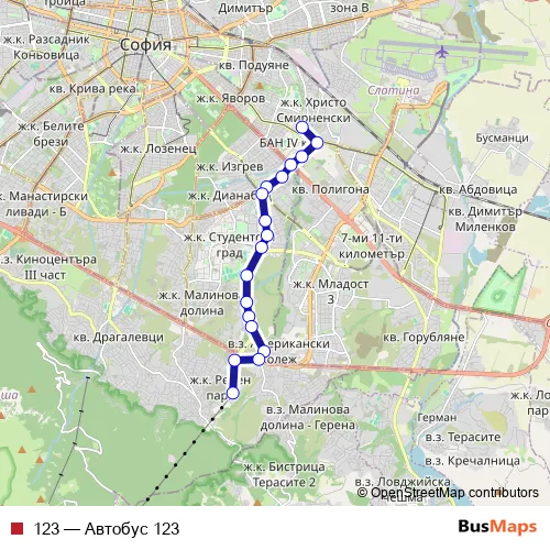 The first stop of the 123 bus route is Автостанция ГЕО Милев and the last stop is Лифта Симеоново. 123 (Автобус 123) is operational during ежедневно.