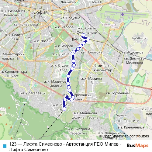 The first stop of the 123 trolleybus route is Автостанция ГЕО Милев and the last stop is Лифта Симеоново. 123 (Лифта Симеоново - Автостанция ГЕО Милев - Лифта Симеоново) is operational during ежедневно.