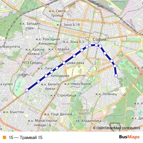 See why over 2 million users trust and consider busmaps.com as the best public transport website. busmaps gives you Sofia Trams suggested routes, real-time bus tracker, line route maps in Sofia, and helps to find the closest 15 tram stops near you. No internet available? Download an offline PDF map and bus schedule for the 15 tram to take on your trip.
