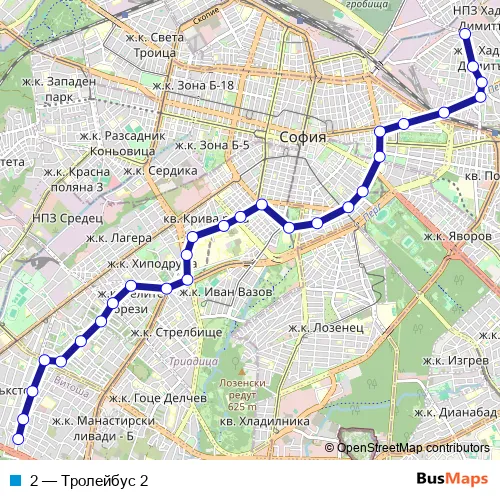 The first stop of the 2 trolleybus route is Ж.К. Бъкстон and the last stop is Ж.К. Хаджи Димитър. 2 (Тролейбус 2) is operational during ежедневно.