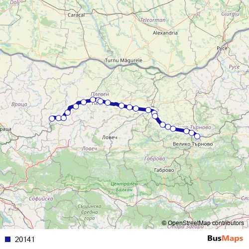 The first stop of the 20141 rail route is Червен Бряг and the last stop is Горна Оряховица. 20141 is operational during ежедневно.