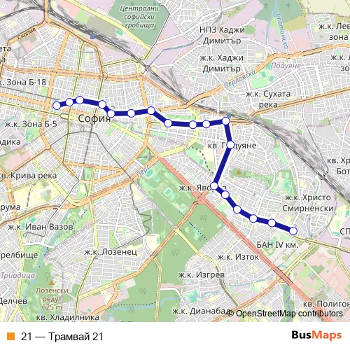 See why over 2 million users trust and consider busmaps.com as the best public transport website. busmaps gives you Sofia Trams suggested routes, real-time bus tracker, line route maps in Sofia, and helps to find the closest 21 tram stops near you. No internet available? Download an offline PDF map and bus schedule for the 21 tram to take on your trip.