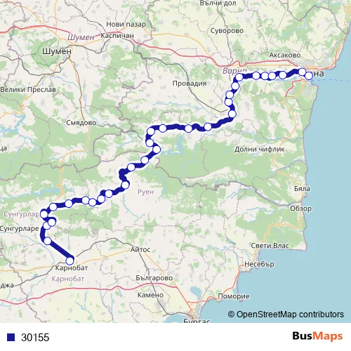 The first stop of the 30155 rail route is Карнобат and the last stop is Варна. 30155 is operational during ежедневно.