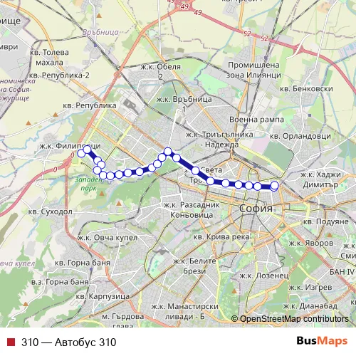 See why over 2 million users trust and consider busmaps.com as the best public transport website. busmaps gives you Sofia Buses suggested routes, real-time bus tracker, line route maps in Sofia, and helps to find the closest 310 bus stops near you. No internet available? Download an offline PDF map and bus schedule for the 310 bus to take on your trip.