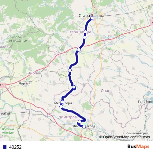 The first stop of the 40252 rail route is Димитровград and the last stop is Стара Загора. 40252 is operational during ежедневно.