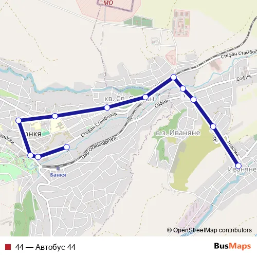 The first stop of the 44 bus route is Автостанция Банкя and the last stop is КВ. Иваняне. 44 (Автобус 44) is operational during ежедневно.