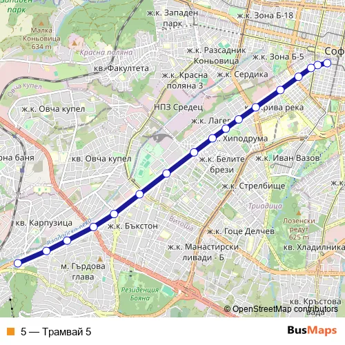 See why over 2 million users trust and consider busmaps.com as the best public transport website. busmaps gives you Sofia Trams suggested routes, real-time bus tracker, line route maps in Sofia, and helps to find the closest 5 tram stops near you. No internet available? Download an offline PDF map and bus schedule for the 5 tram to take on your trip.