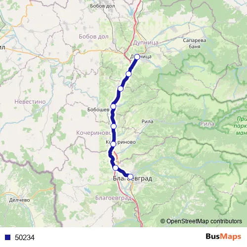 The first stop of the 50234 rail route is Благоевград and the last stop is Дупница. 50234 is operational during ежедневно.
