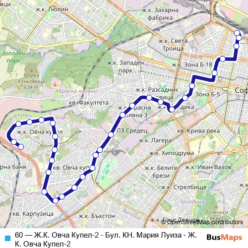The first stop of the 60 trolleybus route is Ж.К. Овча Купел-2 and the last stop is Бул. КН. Мария Луиза. 60 (Ж.К. Овча Купел-2 - Бул. КН. Мария Луиза - Ж.К. Овча Купел-2) is operational during ежедневно.