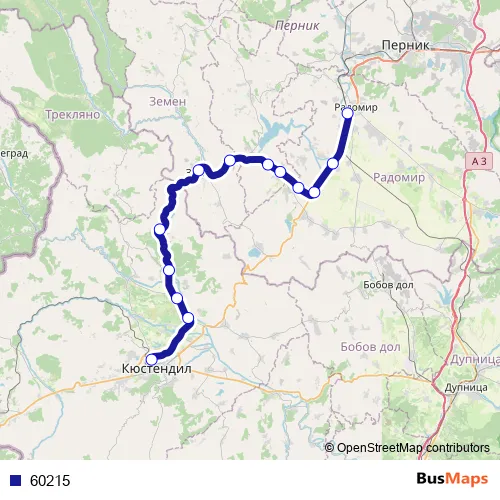 The first stop of the 60215 rail route is Радомир and the last stop is Кюстендил. 60215 is operational during ежедневно.