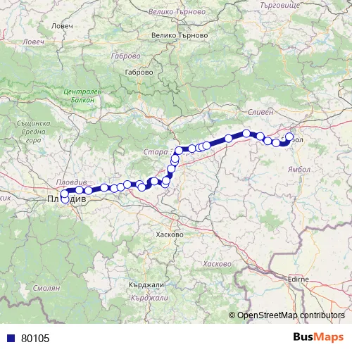 The first stop of the 80105 rail route is Централна гара Пловдив and the last stop is Ямбол. 80105 is operational during ежедневно.