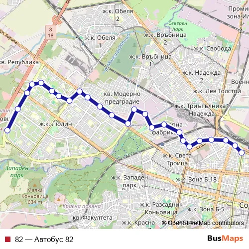 See why over 2 million users trust and consider busmaps.com as the best public transport website. busmaps gives you Sofia Buses suggested routes, real-time bus tracker, line route maps in Sofia, and helps to find the closest 82 bus stops near you. No internet available? Download an offline PDF map and bus schedule for the 82 bus to take on your trip.