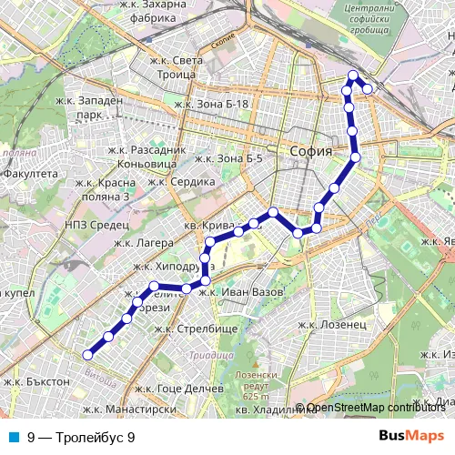 The first stop of the 9 trolleybus route is Ж.К. Борово and the last stop is ПЛ. Сточна Гара. 9 (Тролейбус 9) is operational during ежедневно.