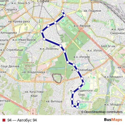 The first stop of the 94 bus route is СУ СВ. Климент Охридски and the last stop is Студентски Град. 94 (Автобус 94) is operational during ежедневно.