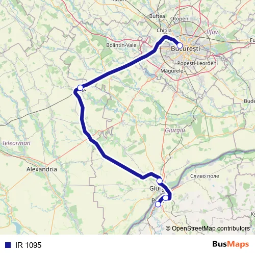 The first stop of the IR 1095 rail route is Bucureşti Nord Gr.A and the last stop is Ruse. IR 1095 is operational during ежедневно.