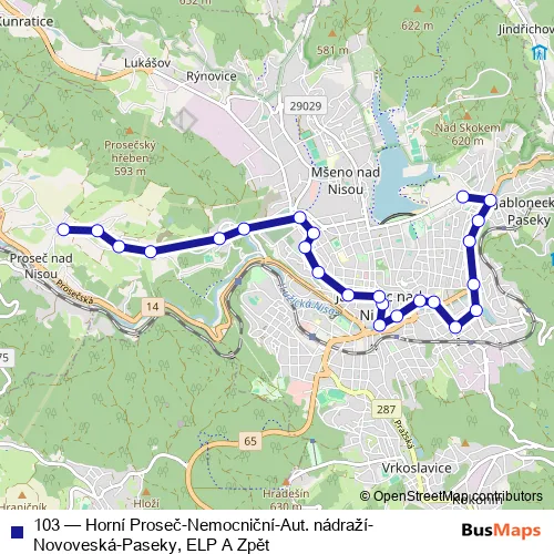 The first stop of the 103 bus route is Jablonec nad Nisou, autobusové nádraží and the last stop is Jablonec nad Nisou, Proseč nad Nisou, Horní Proseč. 103 (Horní Proseč-Nemocniční-Aut. nádraží-Novoveská-Paseky, ELP A Zpět) is operational during ежедневно.