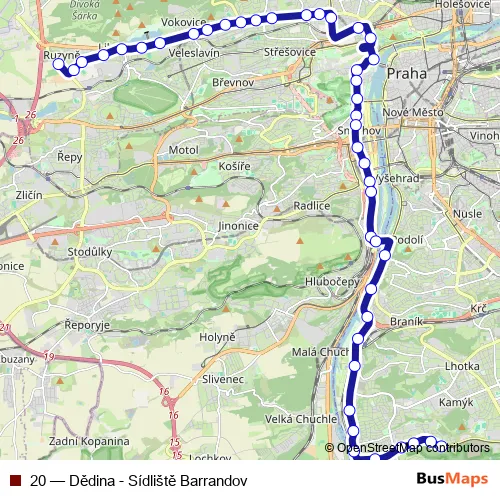 Vozovna Vokovice. 20 (Dědina - Sídliště Barrandov) is operational during ежедневно.