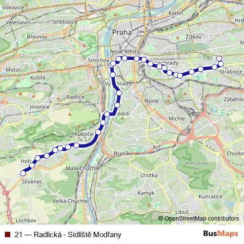 Radlická. 21 (Radlická - Sídliště Modřany) is operational during ежедневно.