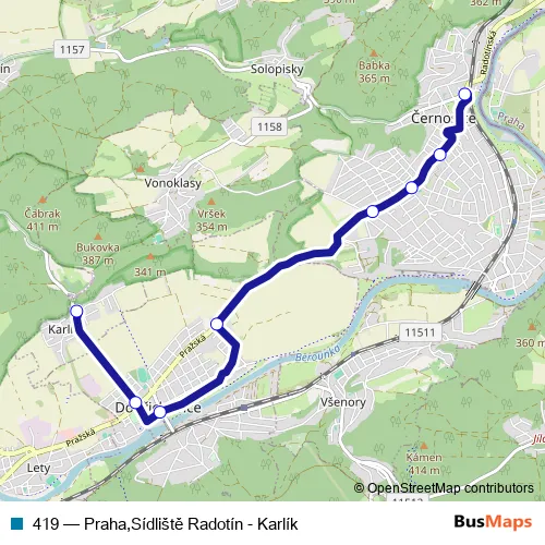 The first stop of the 419 bus route is Karlík and the last stop is Černošice,Žel.zast.. 419 (Praha,Sídliště Radotín - Karlík) is operational during ежедневно.