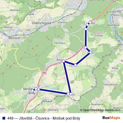 The first stop of the 449 bus route is Jíloviště and the last stop is Mníšek pod Brdy, náměstí. 449 (Jíloviště - Čisovice - Mníšek pod Brdy) is operational during ежедневно.