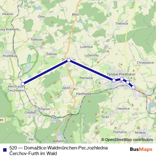 The first stop of the 520 bus route is Klenčí pod Čerchovem, nádraží and the last stop is Domažlice, Vlakové nádraží. 520 (Domažlice-Waldmünchen-Pec,rozhledna Čerchov-Furth im Wald) is operational during ежедневно.