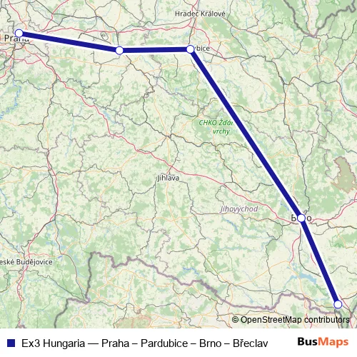 The first stop of the Ex3 Hungaria rail route is Břeclav and the last stop is Praha-Holešovice. Ex3 Hungaria (Praha – Pardubice – Brno – Břeclav) is operational during ежедневно.