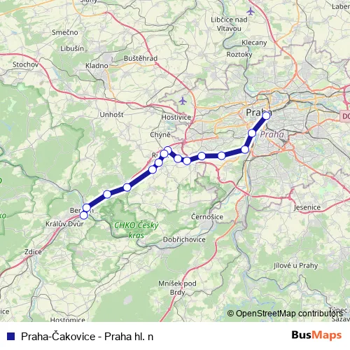 The first stop of the Praha-Čakovice - Praha hl. n rail route is Praha hlavní nádraží and the last stop is Beroun. Praha-Čakovice - Praha hl. n (Praha-Čakovice - Praha hl. n) is operational during ежедневно.