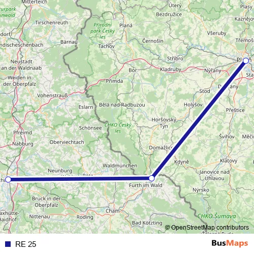 The first stop of the RE 25 bus route is Schwandorf and the last stop is Plzen hl.n.. RE 25 is operational during по выходным.