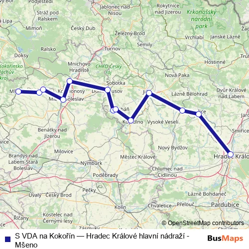 The first stop of the S VDA na Kokořín rail route is Mšeno and the last stop is Hradec Králové hlavní nádraží. S VDA na Kokořín (Hradec Králové hlavní nádraží - Mšeno) is operational during ежедневно.