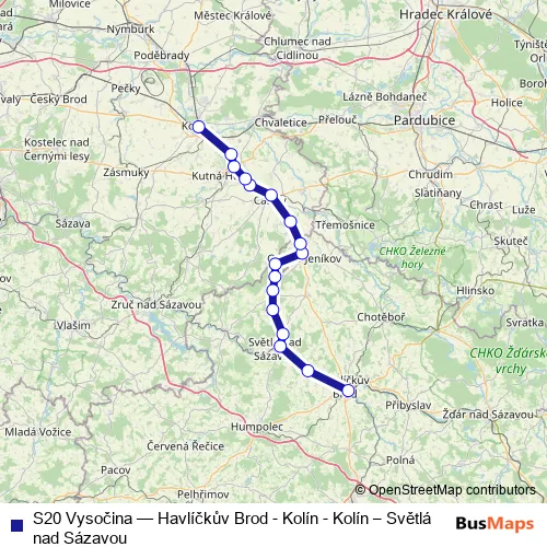 Click here to view the nearest S20 Vysočina - Havlíčkův Brod - Kolín - Kolín – Světlá nad Sázavou rail stop.